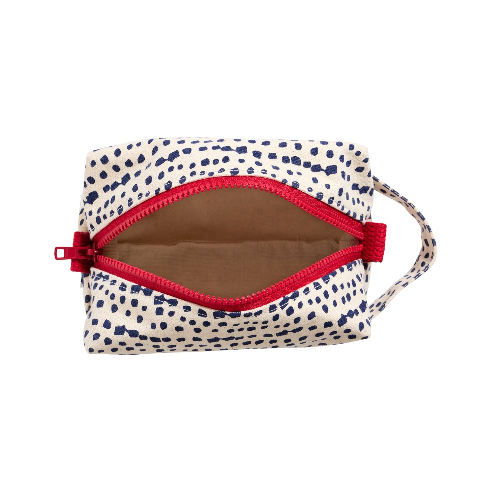This cotton canvas Dopp kit is here to add a pop of personality to your daily routine. Whether you're packing it for a trip or tossing it in your tote, it keeps your essentials organized and easy to grab. The screenprinted, durable 15 oz cotton canvas shell has a bright zip top that brings the kind of contrast that’s just plain fun. Fully lined with a side handle for grab-and-go ease—it’s cute, bold, and built to last.